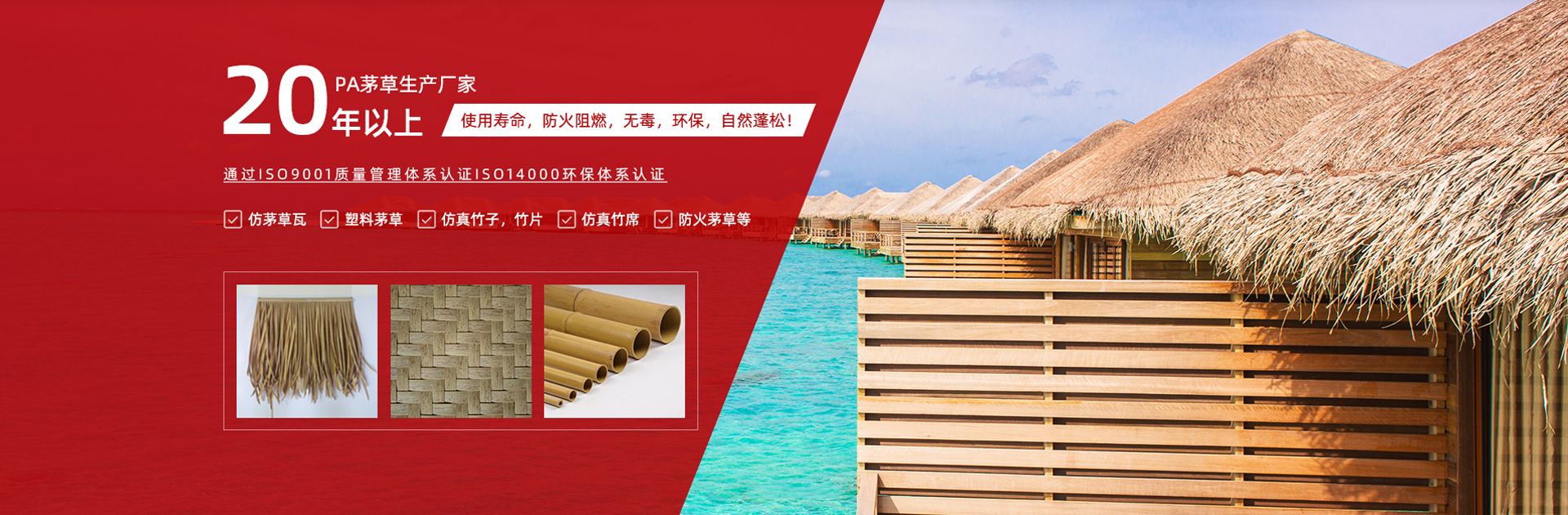 我們是一家專業生產、專業制造、專業研發、專業銷售仿茅草瓦/塑料茅草/仿真竹子,竹片/仿真竹席/防火茅草等生產商,廠房占地面積6000平方米,擁有進口大型生產設備40余臺。公司已通過ISO9001質量管理體系認證ISO14000環保體系認證。
